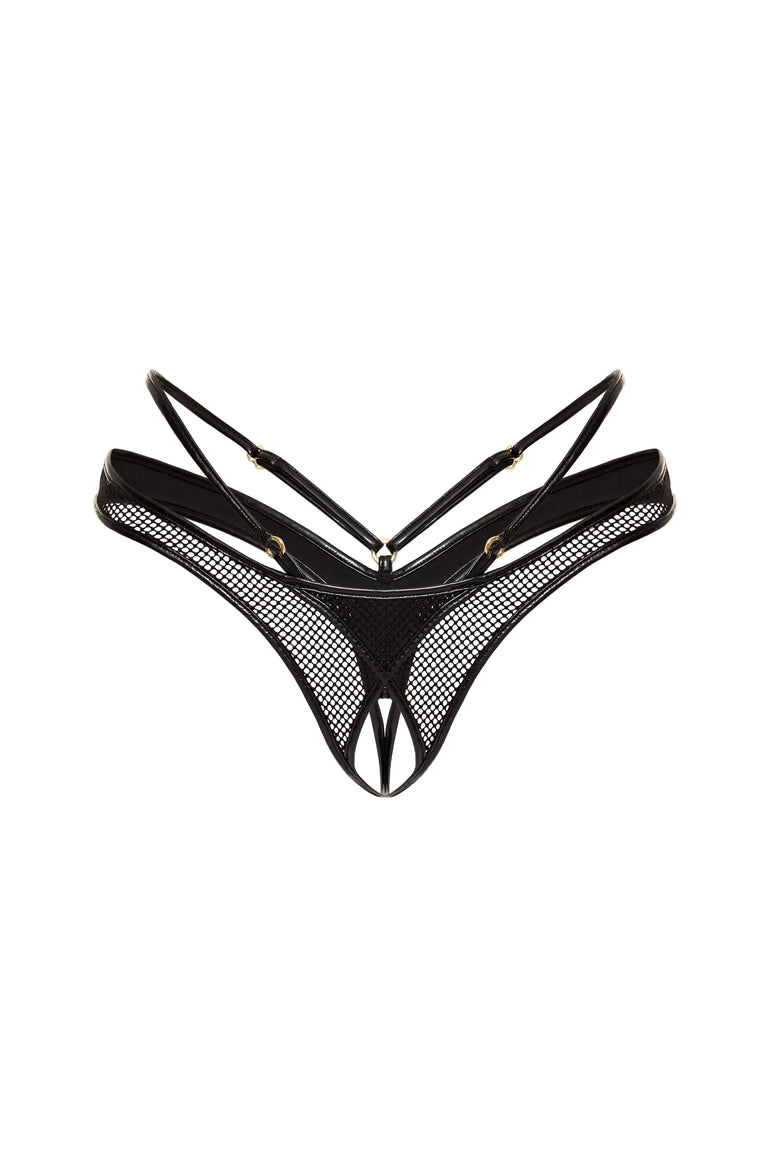 • Glossy lacquered accents meet a V-shaped fishnet insert, framed by daring straps and an open center detail.