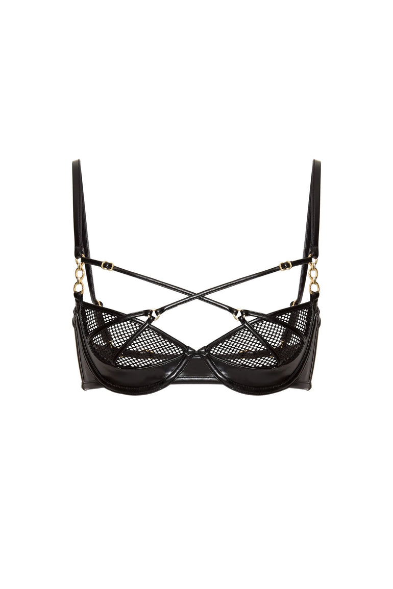• Fishnet texture, sculpting underwire cups, strappy front detailing with gold accents