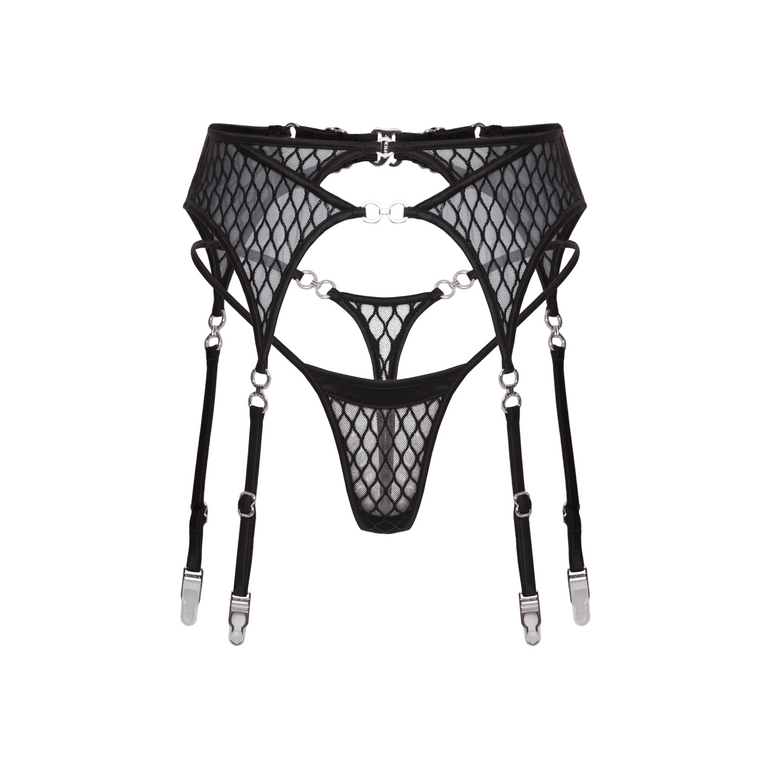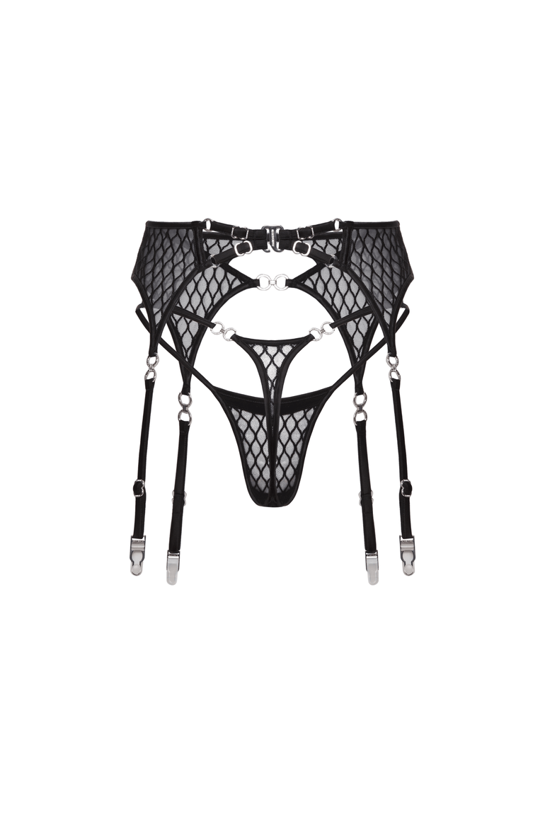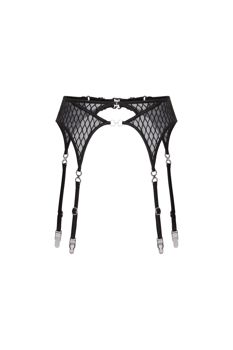The Emma suspender balances bold fishnet embroidery with refined strap-work and polished metal details. Cut high on the waist to define your shape, with adjustable garter straps that follow your every move. It holds — and reveals — just enough.