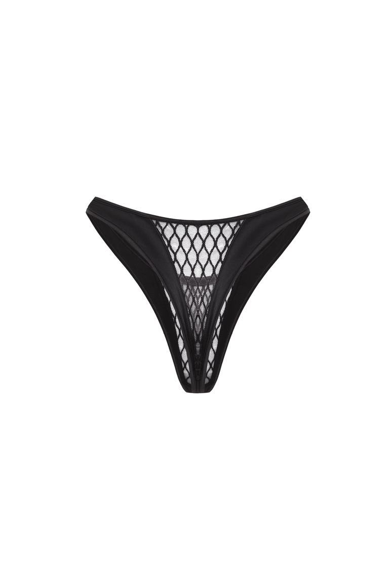 Leona black panties combine bold fishnet embroidery with sleek, minimalist lines. The high-cut shape elongates the legs, while the barely-there back leaves a lasting impression. Refined enough to wear under anything — striking enough to wear under nothing.