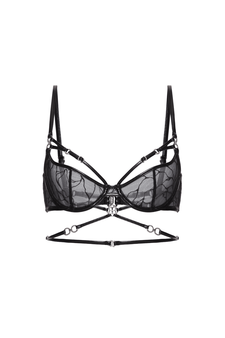 The Esme Bra — where soft embroidered mesh meets bold framing straps in a silhouette that sculpts, lifts, and commands attention. Semi-sheer cups offer just enough reveal, while the underbust harness wraps the body in all the right places. Every strap adjusts. Every curve is accentuated.